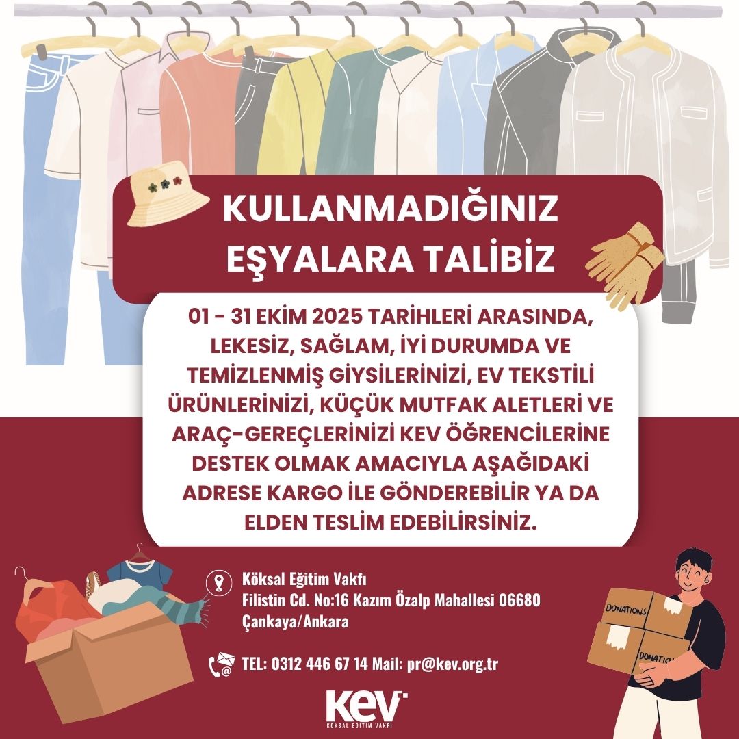 Köksal Eğitim Vakfı olarak üçüncüsünü düzenlediğimiz “Kullanmadığınız Eşyalara Talibiz” kampanyasında toplanan tüm bağışlar, öncelikle vakıf binamızda KEV öğrencilerine, ardından diğer vakıflar aracılığıyla farklı öğrencilere ulaştırılmıştır. Yoğun ilgi ve destekleriniz sayesinde, beklenenden çok daha kısa sürede toplanan kıyafetler, ev tekstili ürünleri ve küçük ev aletleri ihtiyaç sahiplerine teslim edilmiştir. Katkı ve